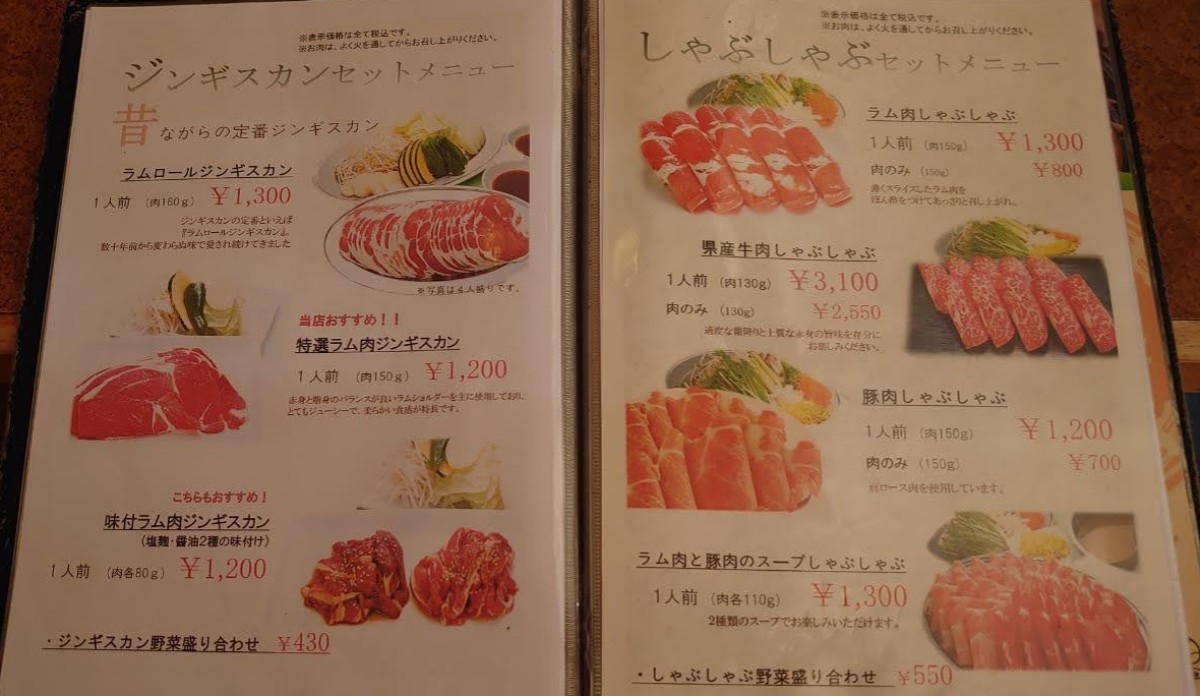 メニュー表にはジンギスカンやラムしゃぶなどの羊肉料理がずらりと並びます。
